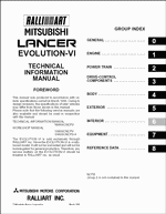 Workshop repair manual Mitsubishi Lancer Evolution IV, V, VI, VII, VIII, IX, 1990-2006, contains the detailed and full description of repair and diagnostics of all units of the automobile, including detailed electric schemes, the moments of inhalings, process of assembly and disassembly of the engine and other units and units, body sizes for an extract of a body, detailed repair transmission automatic and manual, repair of coupling, steering management, the conditioner, all electric components and blocks of the management, the necessary special tool, and as other information. Electrical Wiring diagrams.